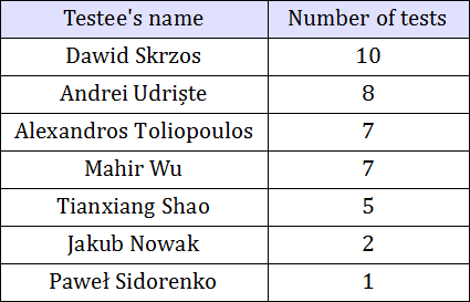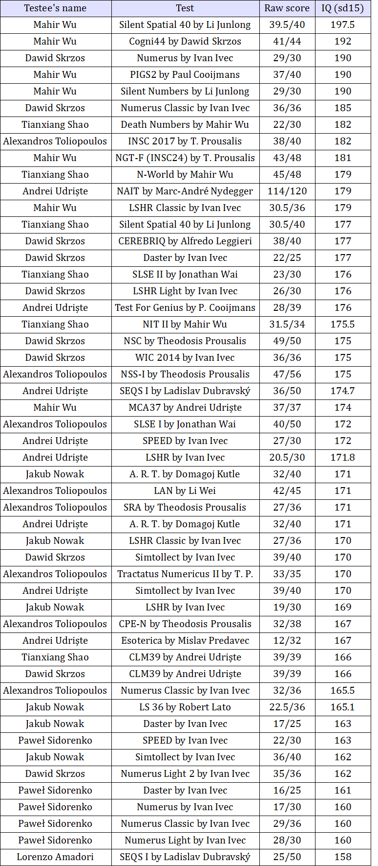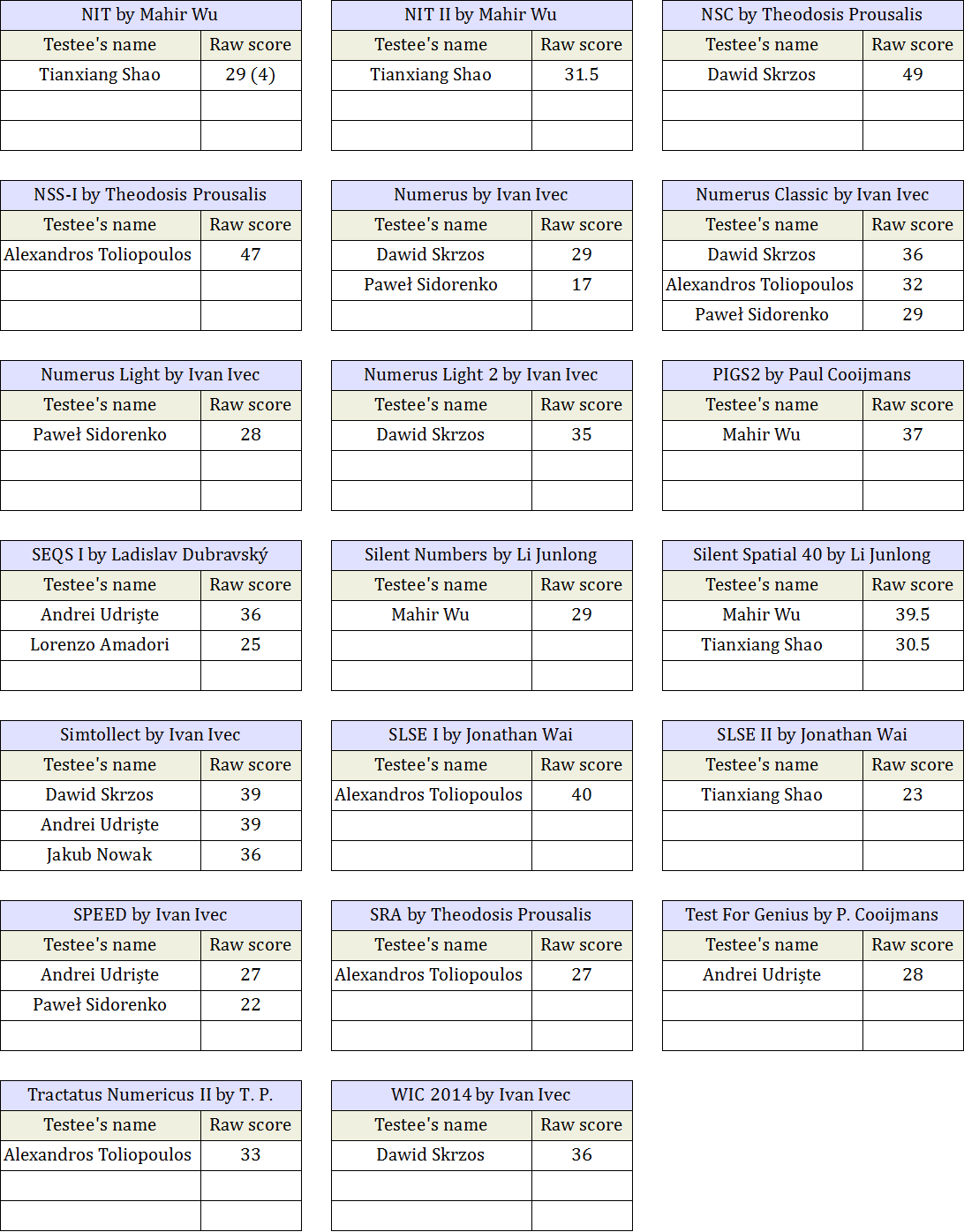 If you wish to be included on the list, please send your score reports to the following email address: dawid.skrzos@o2.pl. Only spatial and numerical test scores are accepted. IQ scores on other types of tests may also be added but they will be evaluated on a case-by-case basis. Currently accepted test authors: Zoran Bijac, Huanyun Chen, Paul Cooijmans, Laurent Dubois, Ladislav Dubravský, Qiao Hansheng, Ivan Ivec, Li Junlong, Domagoj Kutle, Robert Lato, Alfredo Leggieri, Gianluigi Lombardi, Marc-André Nydegger, Mislav Predavec, Theodosis Prousalis, Dawid Skrzos, Alexandros Toliopoulos, Andrei Udriște, Jonathan Wai, Li Wei, Wang Weijie, Mahir Wu.