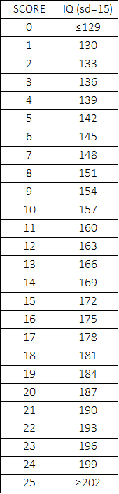 Sense25 is a high range pattern recognition test consisting of 25 numerical items that should be solved in the most logical and simplest way. There is no time limit, and answers should be carefully thought out. Discussion with others about solutions is not allowed. The items are not arranged in order of difficulty. The test is free of charge. To receive your score report, please send your solutions to dawid.skrzos@o2.pl along with proof of your identity. Please also send all of your prior scores on high range IQ tests. This will help me in normalizing the test. Three attempts are allowed, however, only the first two attempts are considered official scores.